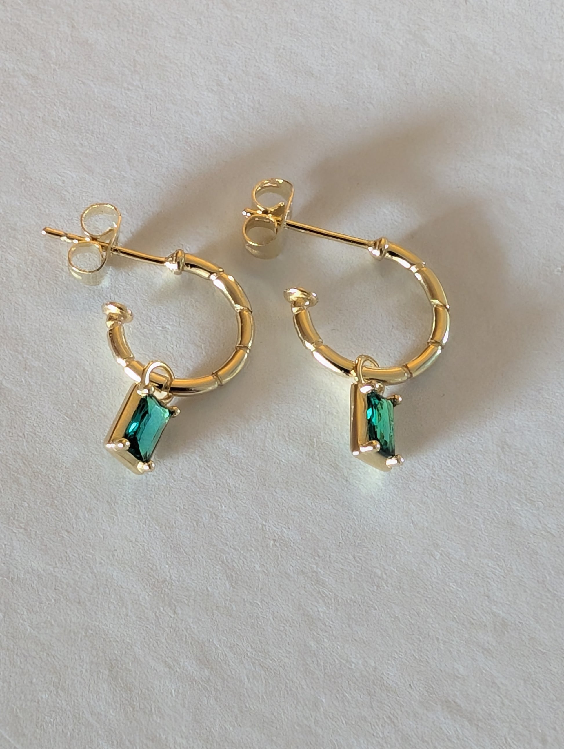 A stunning Sterling silver 18k gold plated hoop with a gorgeous texture and a sparkling Emerald green zircona charm